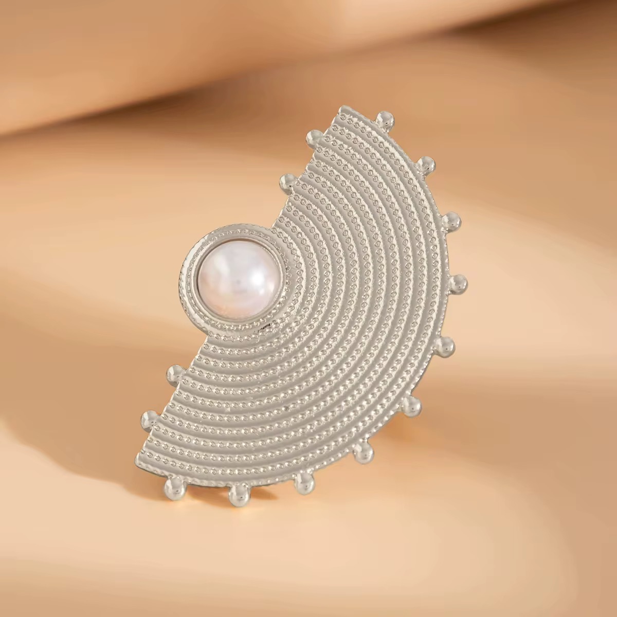 Inspirée des éventails architecturaux de l’Antiquité, la bague Sacrée Nakiss déploie ses lignes concentriques en argent rhodié dans un mouvement circulaire hypnotique.