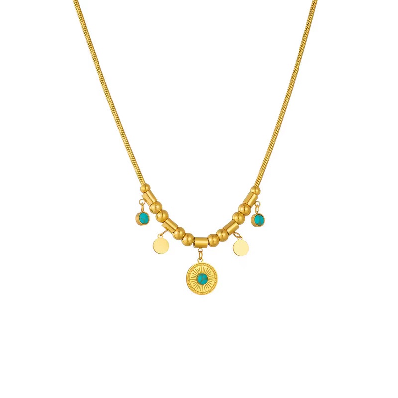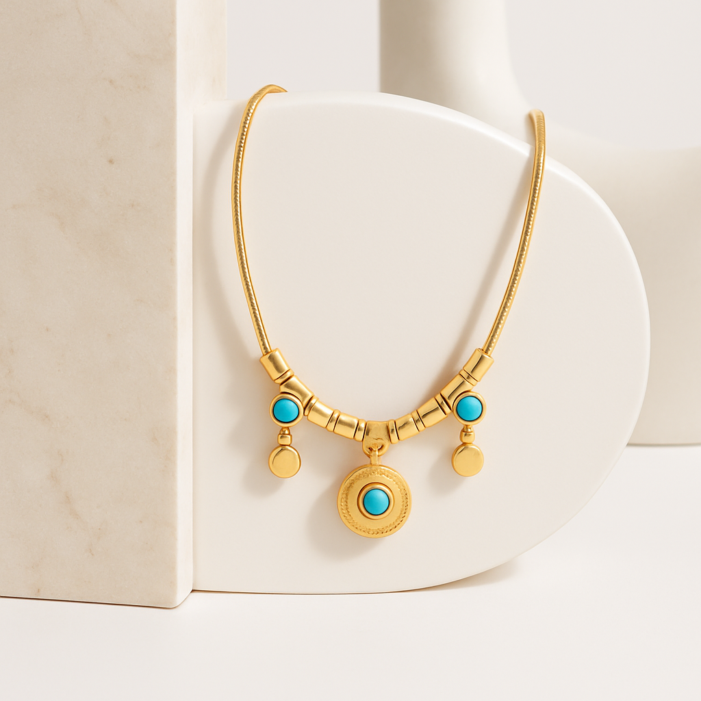 Le collier Auréa Turquoise allie l’intensité du doré à la fraîcheur vibrante de la pierre turquoise. Composé de perles dorées finement polies et de petits pendentifs délicats, il se termine par un médaillon central finement texturé, sublimé d’un éclat turquoise captivant.