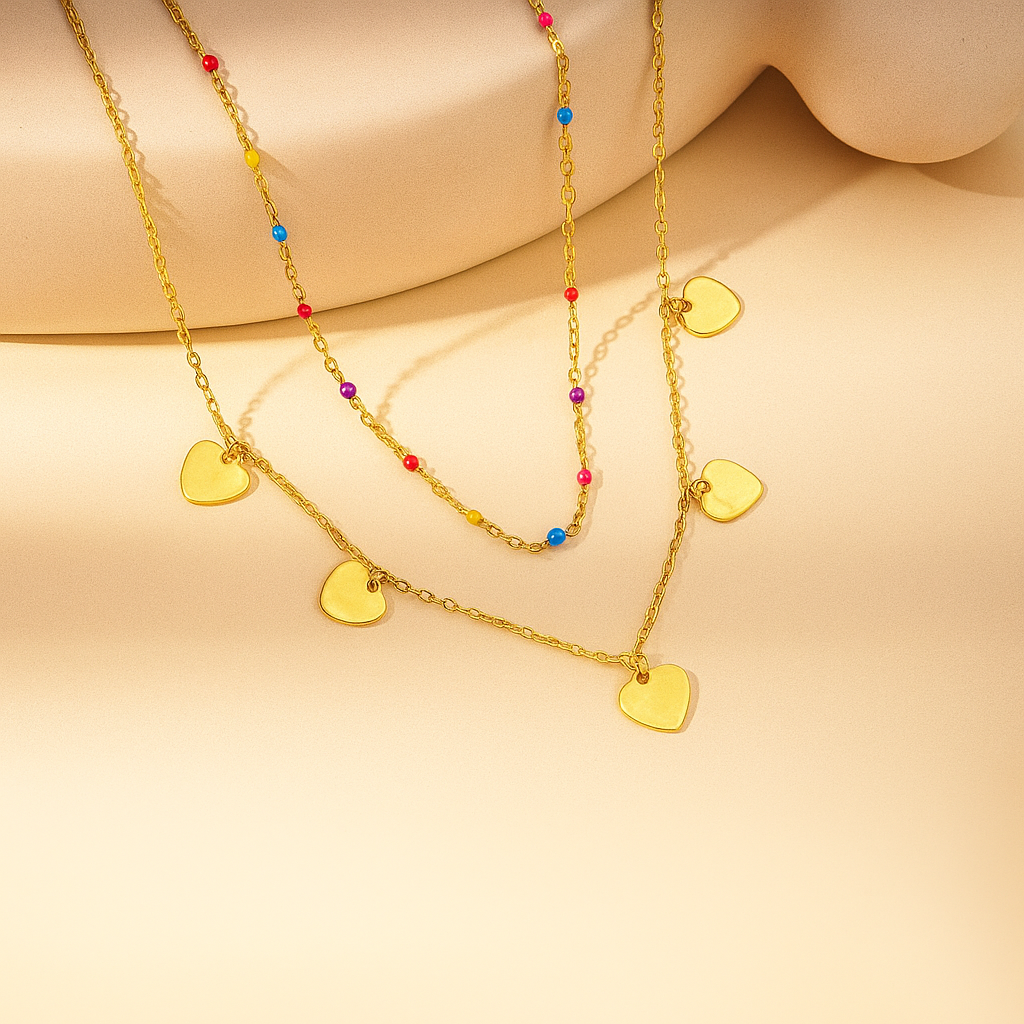 Le collier Cœur Arcadia est une pièce délicate et lumineuse qui combine la douceur de petits cœurs dorés avec l’éclat joyeux de perles colorées. Ses deux rangs fins apportent un charme moderne et féminin, offrant un équilibre parfait entre élégance et légèreté.