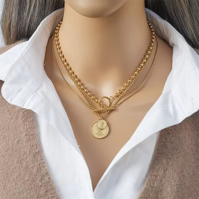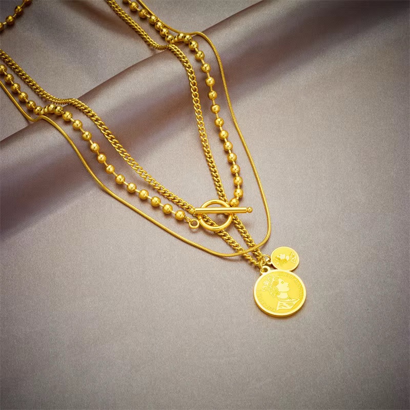 Un collier multi-rangs dorĂ©, sublimĂ© par des mĂ©dailles royales et des perles mĂ©talliques. Une pièce audacieuse et sophistiquĂ©e qui apporte un Ă©clat impĂ©rial Ă chaque tenue. ✨