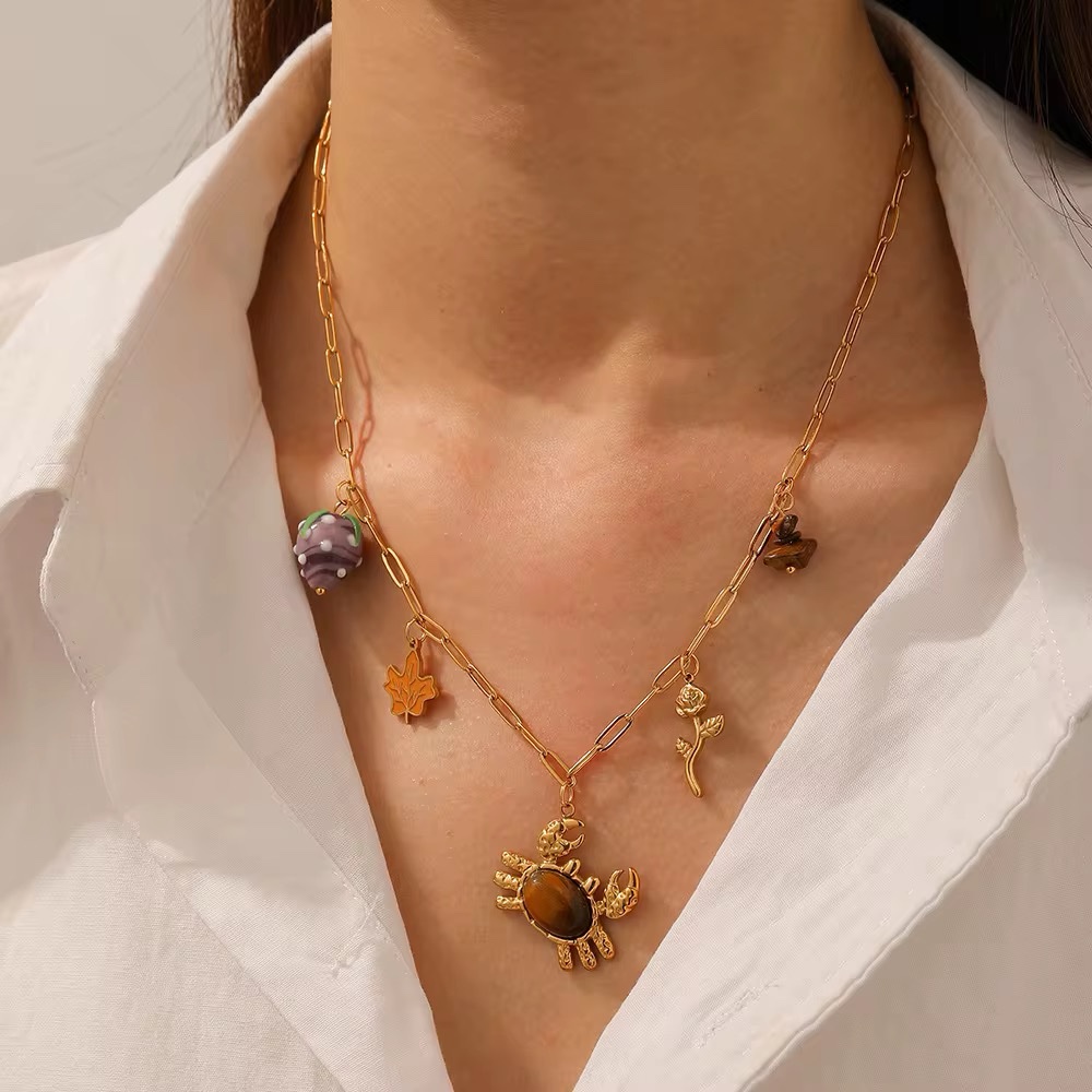 Un collier délicat inspiré de la nature, orné de charms raffinés : une fraise colorée, une feuille dorée, une petite rose et un crabe serti d’une pierre chaleureuse. Jardin Doré évoque la beauté naturelle et apporte une touche originale, lumineuse et élégante à chaque tenue.