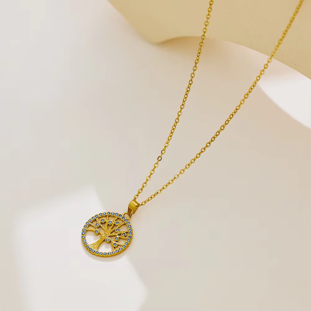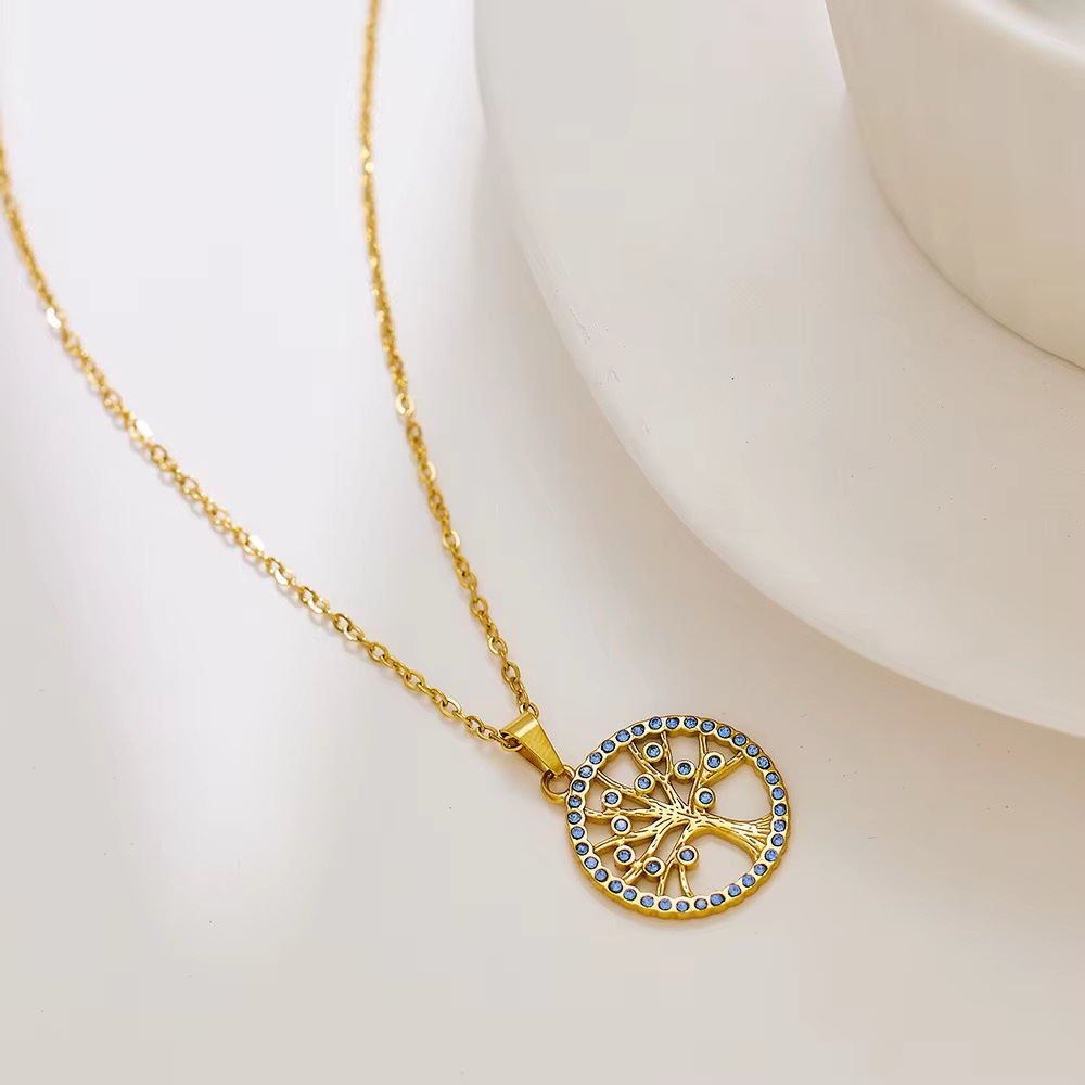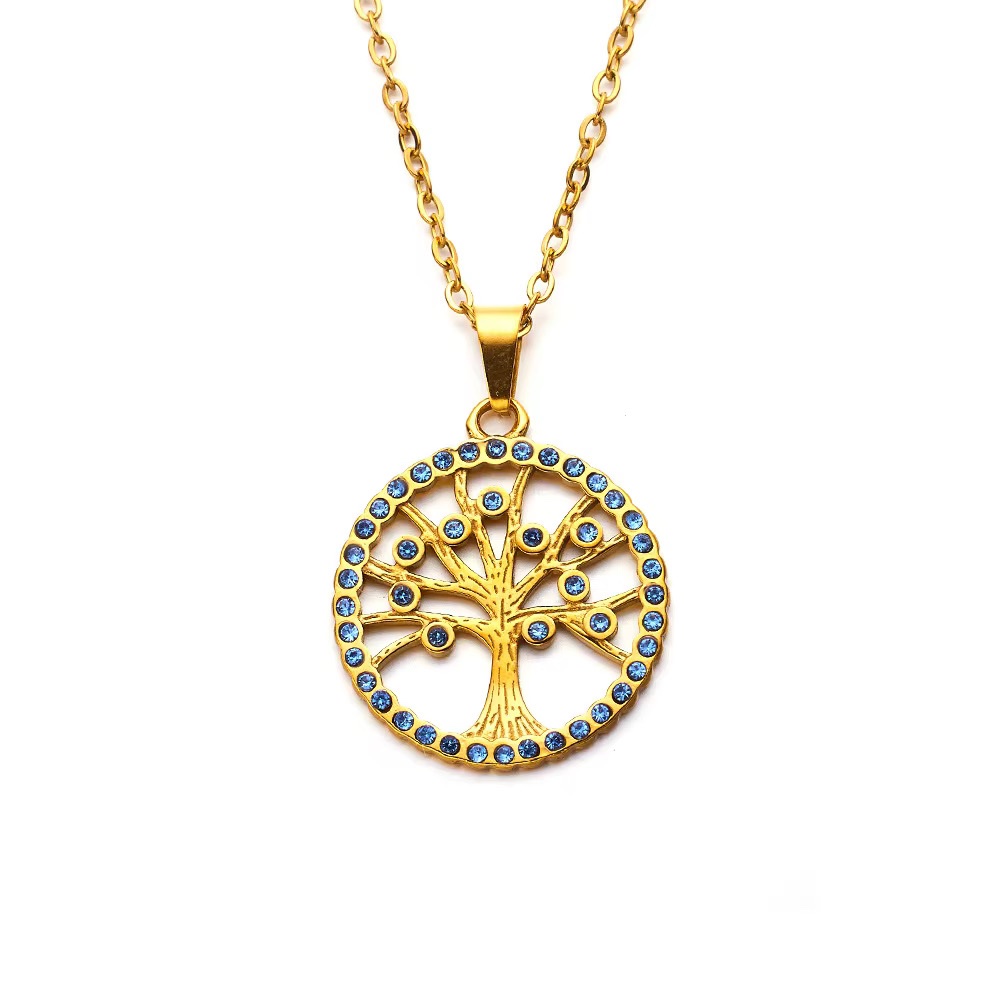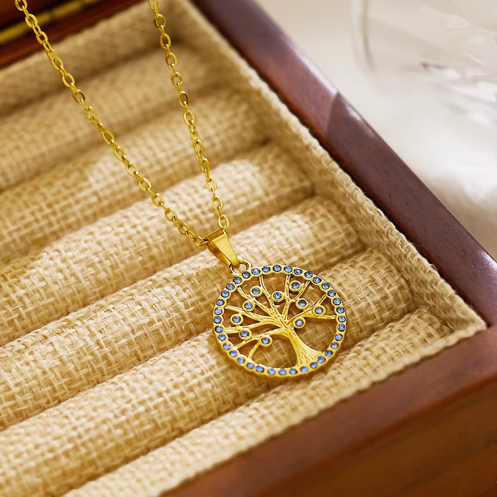 Un collier doré orné d’un pendentif arbre de vie serti de pierres bleues. Une pièce lumineuse symbolisant force, croissance et harmonie. ✨