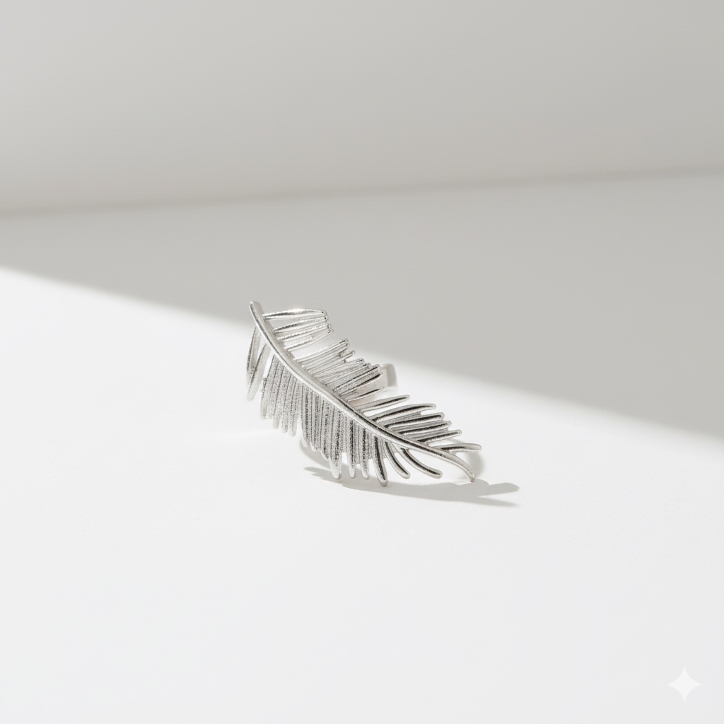 Une bague délicatement sculptée en forme de plume argentée, symbole de légèreté et d’élégance. Sa silhouette aérienne enveloppe le doigt d’un éclat subtil, parfait pour sublimer chaque geste avec finesse.